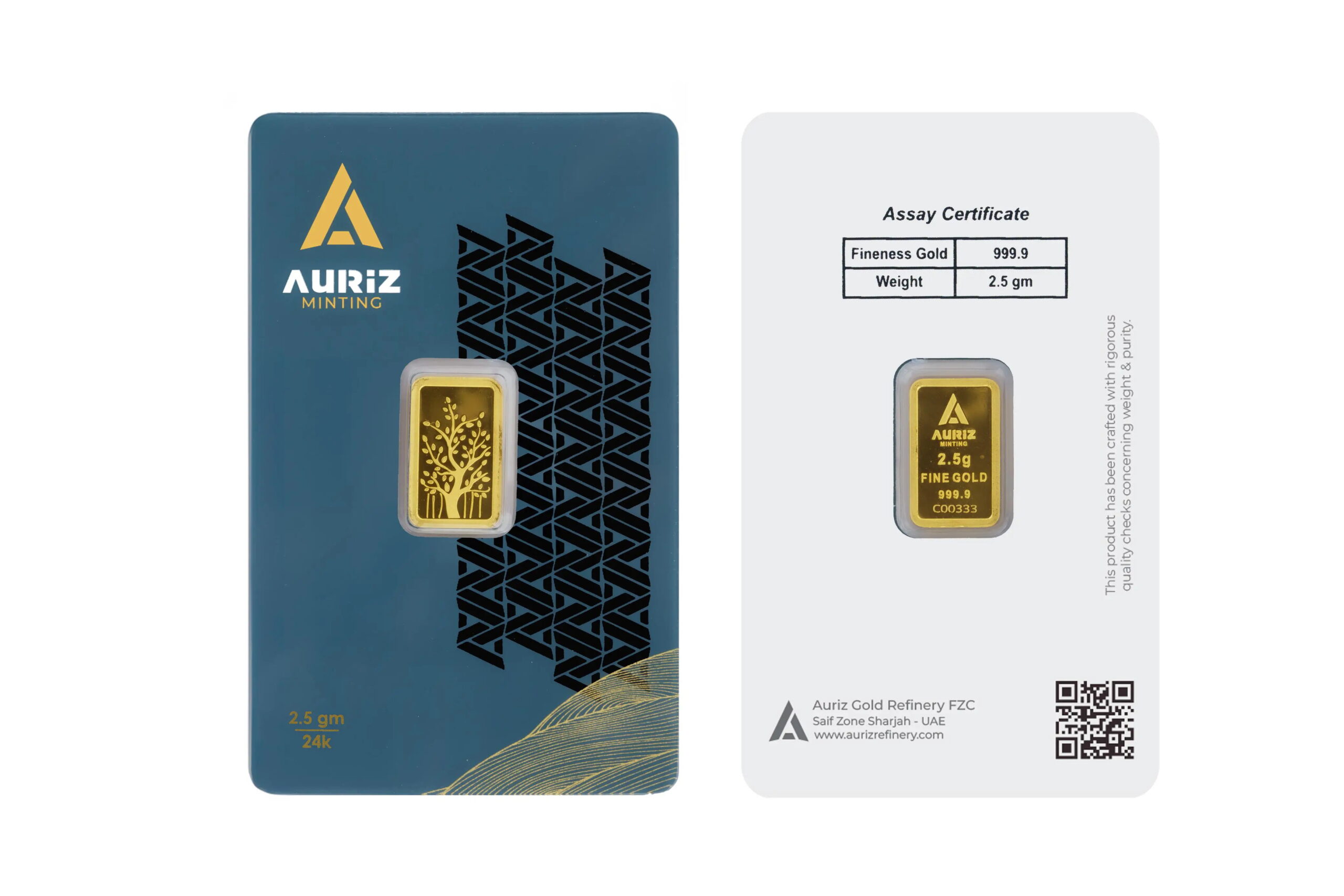 This 2.5g pure gold bar has been manufactured by Auriz in Dubai and adheres to the requirements LBMA criteria for refining credentials and purity .It is minted with the finest purity of 999.9 24K Gold. Packaged with Assay certificate.