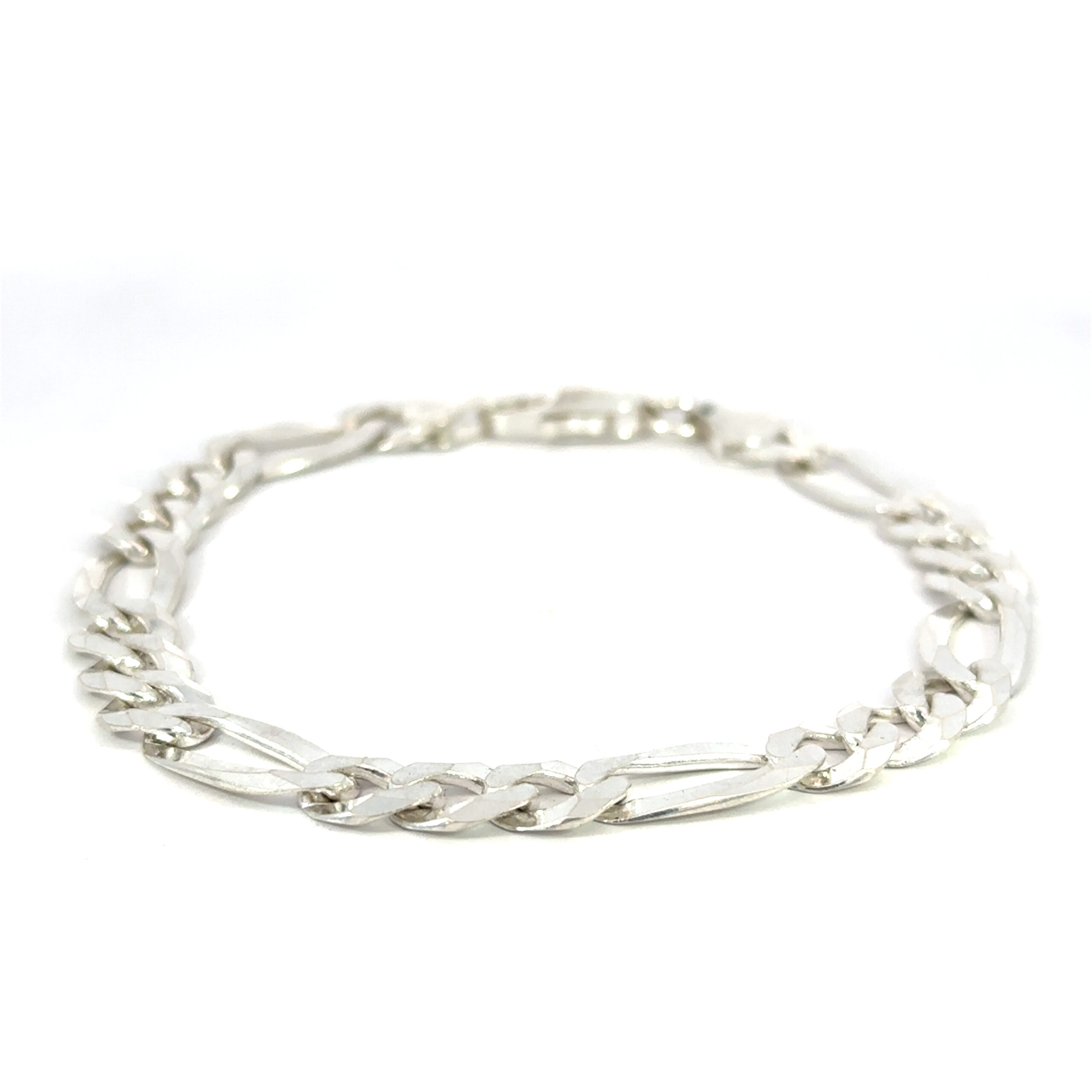 This elegantly crafted chain bracelet is fashioned from sterling silver. Its Italian inspired design showcases a classic Figaro link pattern, known for its distinctive arrangement of flattened links. The bracelet secures with a sturdy clasp, ensuring both style and security for everyday wear.UK 925 hallmarked. 8 inch, 12.66g