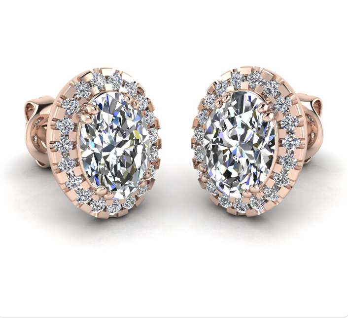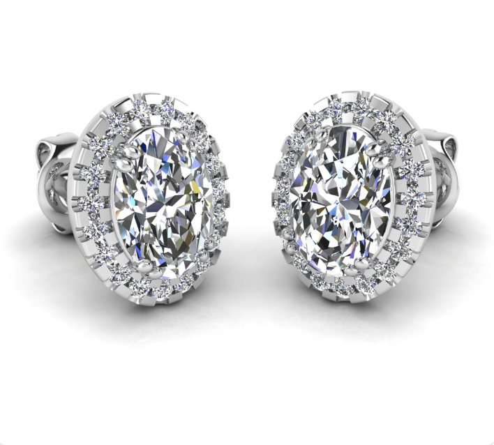 Gold Solitaire halo earrings set with 2 x Oval 0.3 Ct , VS clarity diamonds within 4 curved profiled prongs. Set within a halo of 19 small VS diamonds totalling 0.1Ct approx in each earring. Available in 9K,14K,18K gold or Platinum set with Lab or mined diamonds