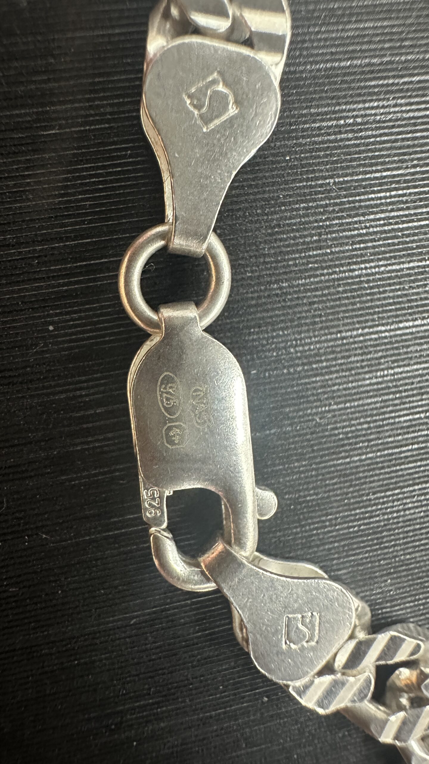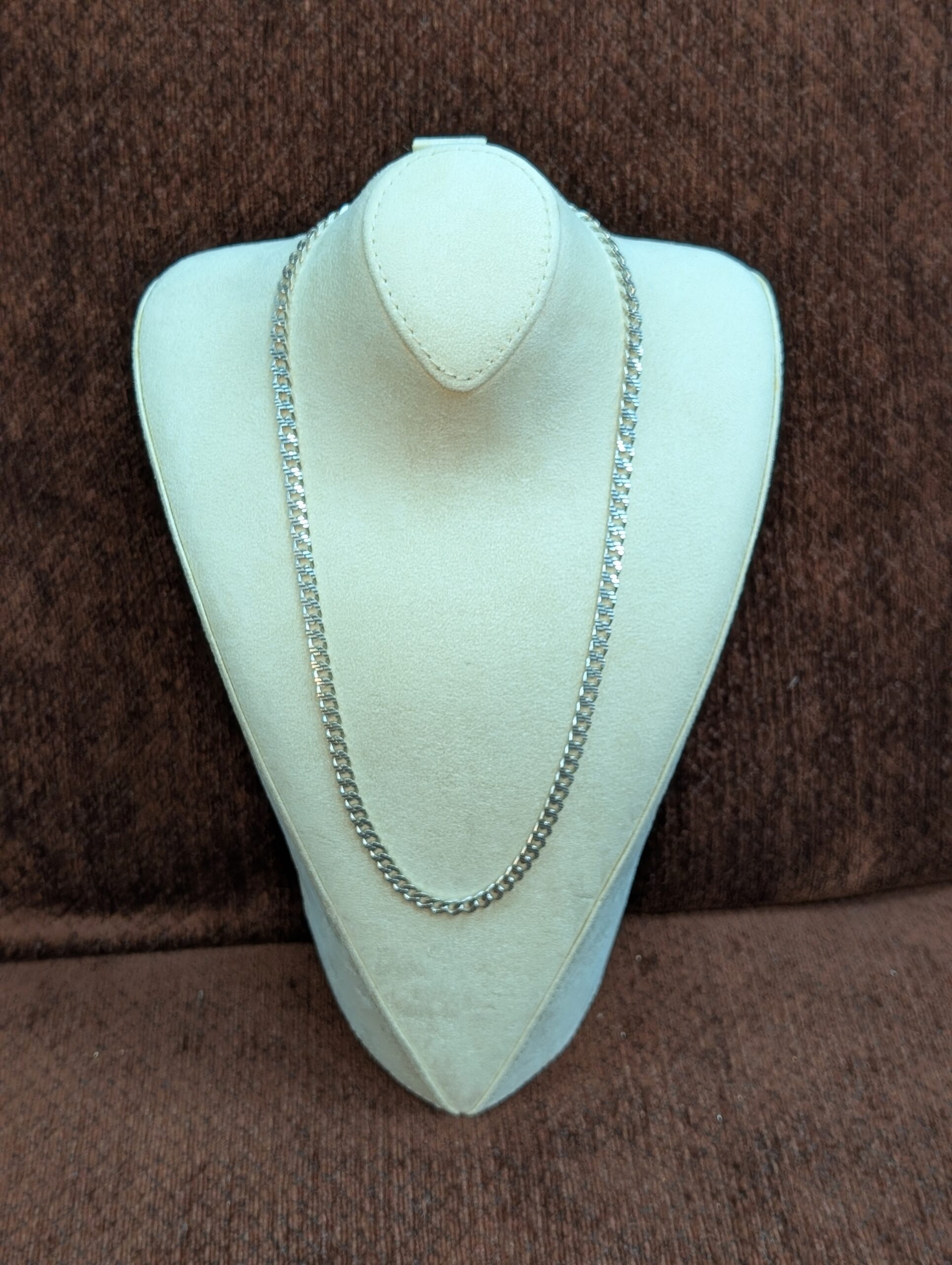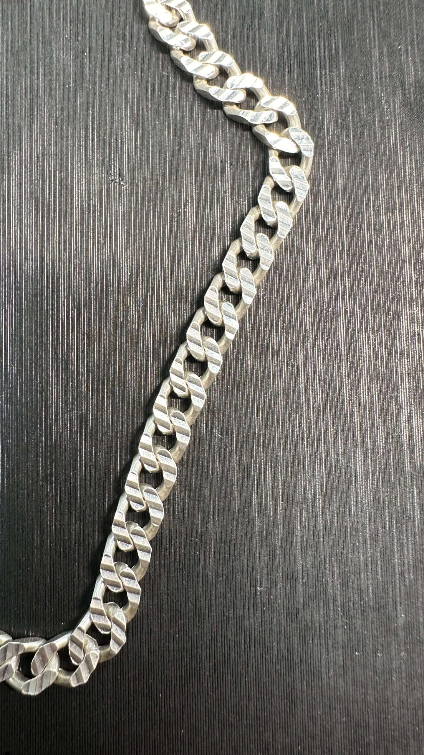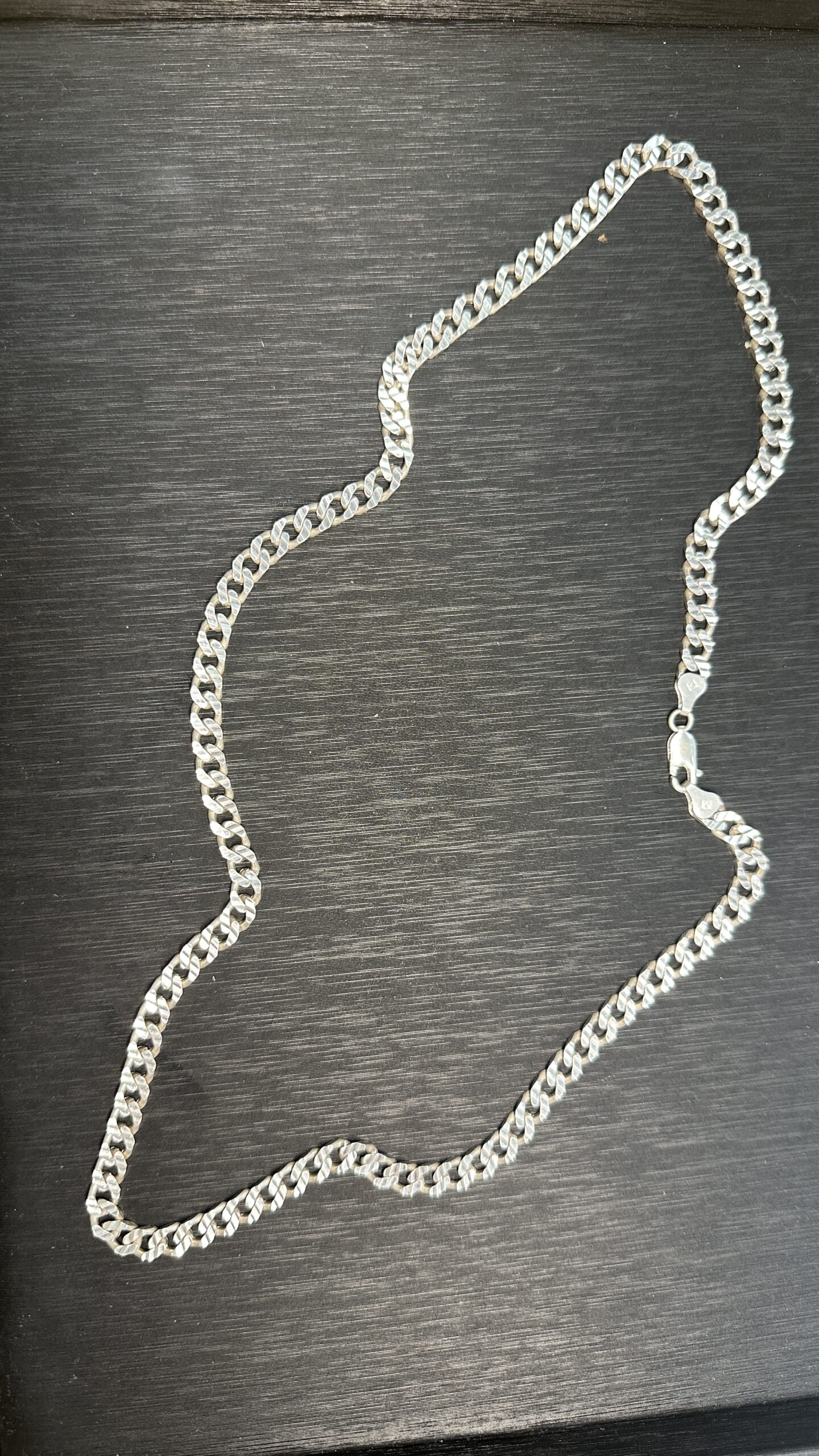 Elevate your style with this sleek sterling silver chain. Crafted with a classic curb link design, this timeless piece adds a touch of sophistication to any ensemble. Its durable construction ensures lasting quality, making it a versatile accessory for everyday wear or special occasions. A perfect foundation for pendants or a statement on its own. 33.84g, 24″ Length.