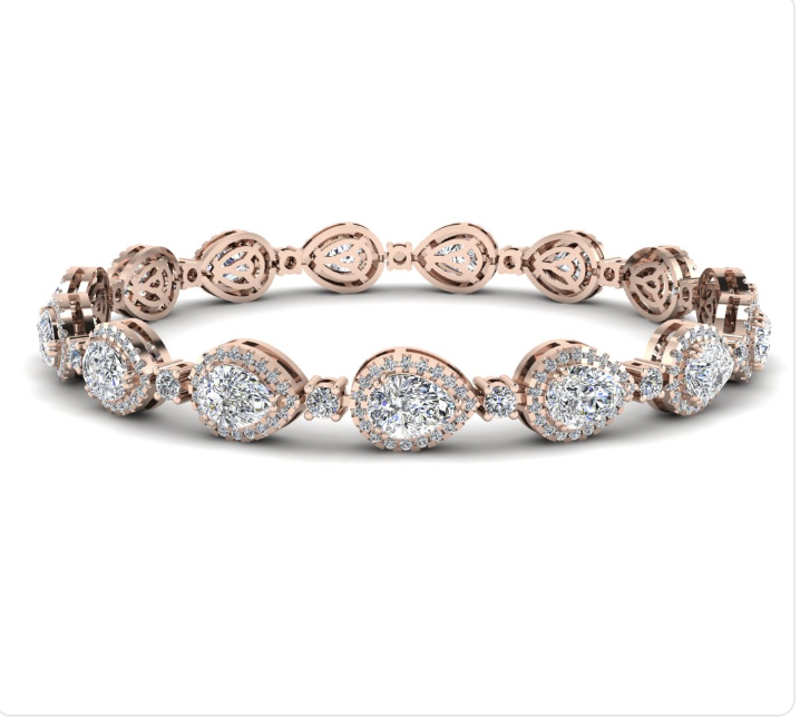 Elevate your style with this exquisite gold tennis bracelet. Featuring a series of pear shaped diamonds with brilliant cutting styles, this bracelet exudes sophistication and timeless elegance. Its flexible design ensures a comfortable fit, perfect for both everyday wear and special occasions.A diamond tennis bracelet is a type of elegant, continuous bracelet that features a single line of uniform diamonds, set closely together. This design creates a seamless, glittering effect that wraps around the wrist. The diamonds are typically set in a metal band, which can be made of white gold, yellow gold, rose gold, or platinum, depending on personal preference.These bracelets are known for their timeless and sophisticated style, making them a popular choice for special occasions and as a luxurious accessory for formal or semi-formal outfits. The diamonds in a tennis bracelet are often of high quality, with clarity, cut, colour, and carat weight (the 4 Cs) carefully considered to ensure brilliance and sparkle. Check various options in 9K to 18K gold or platinum , set with pear shaped and an arrangement of individual halos shape lab grown or natural mined with total carat weight of 12CT.