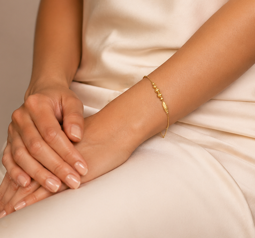 Elevate your style with this exquisite gold chain bracelet. Delicately crafted, this bracelet features a fine gold chain adorned with intricately designed gold beads. The faceted detailing of the beads creates a captivating play of light, adding a touch of sophistication to any ensemble. Perfect for adding a subtle sparkle to your everyday look or completing a special occasion outfit.