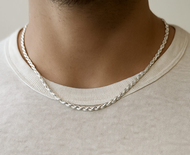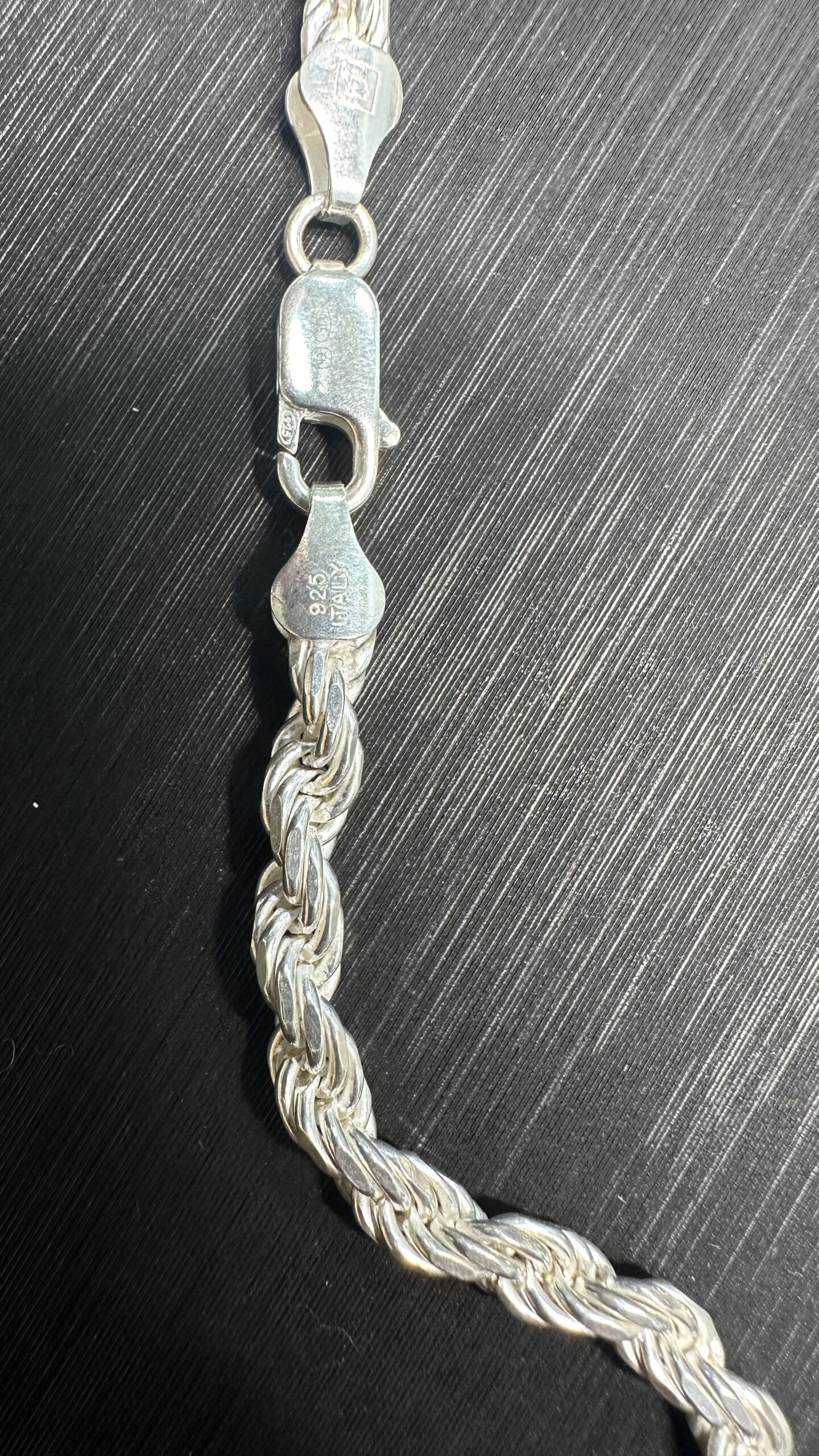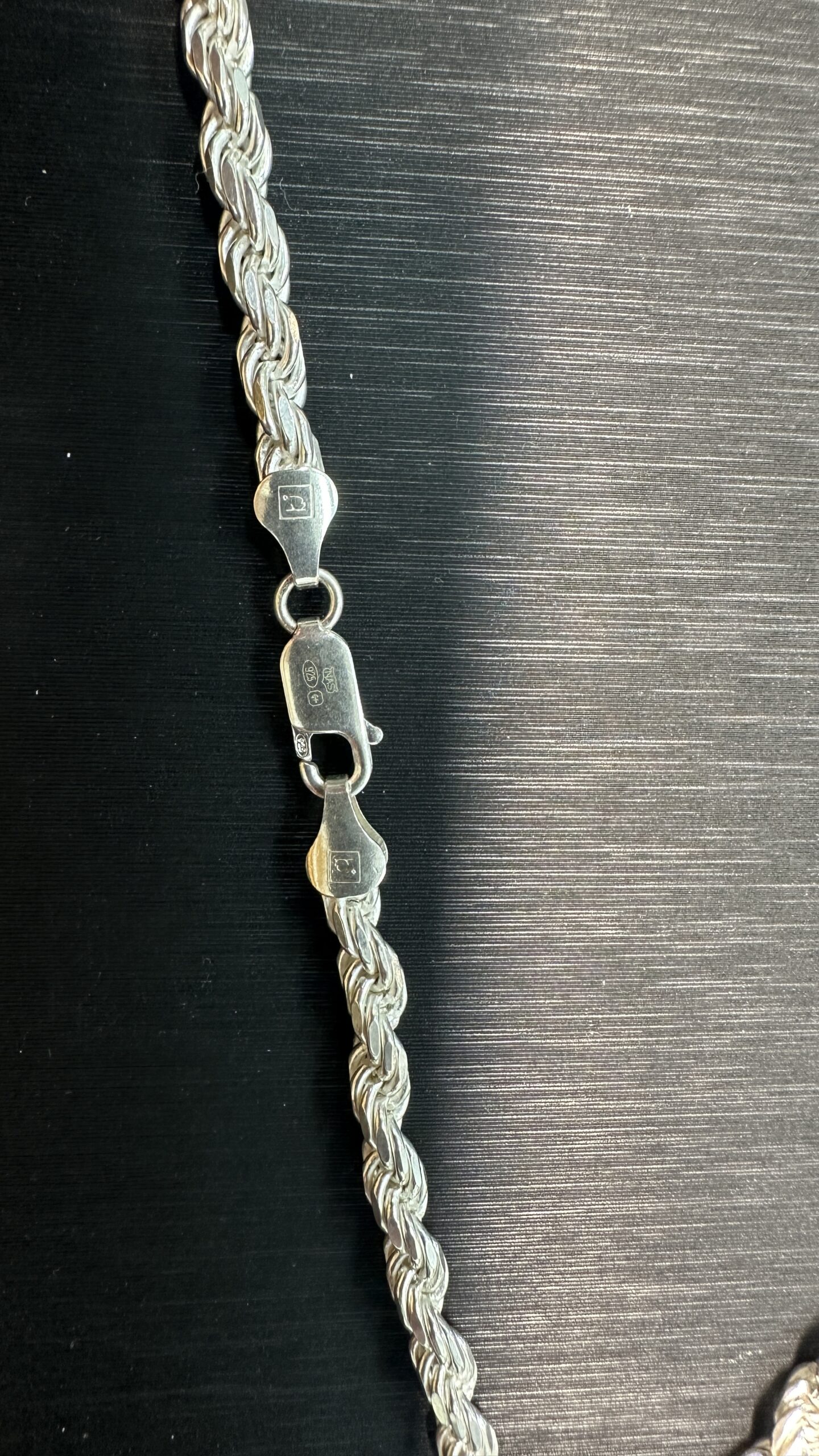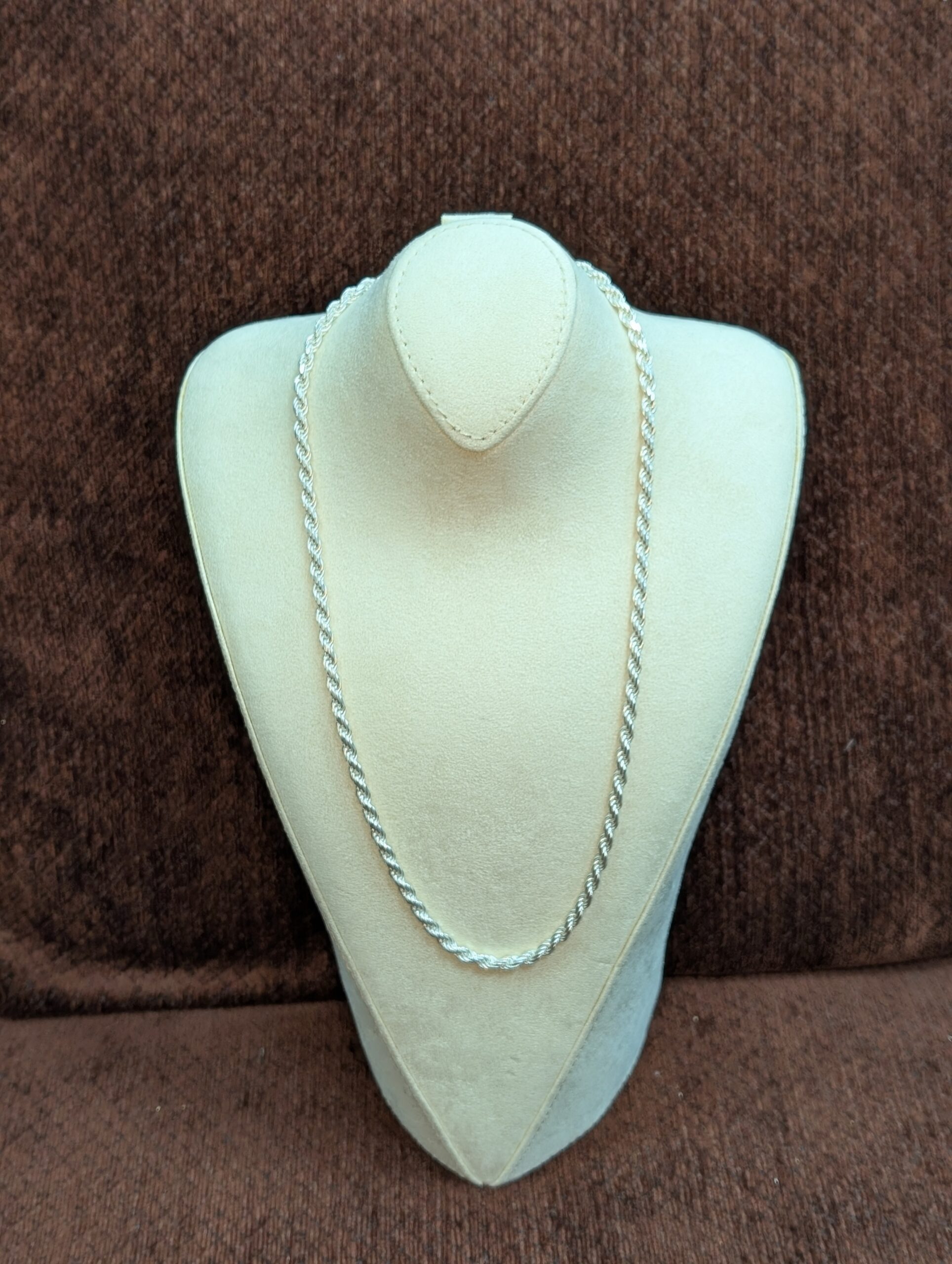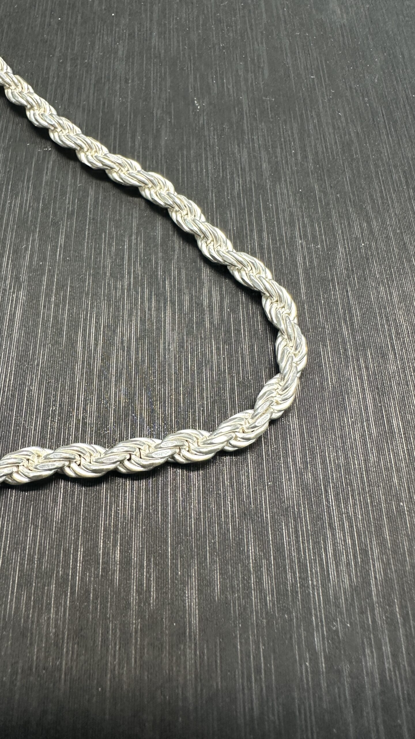 This chic chain necklace features a delicate braided rope design crafted from polished silver. The gleaming finish complements the intricate details, making it a versatile piece for both casual and elegant looks. Its understated yet stylish aesthetic makes it a perfect addition to any jewellery collection, offering a touch of refined simplicity. 44.27g