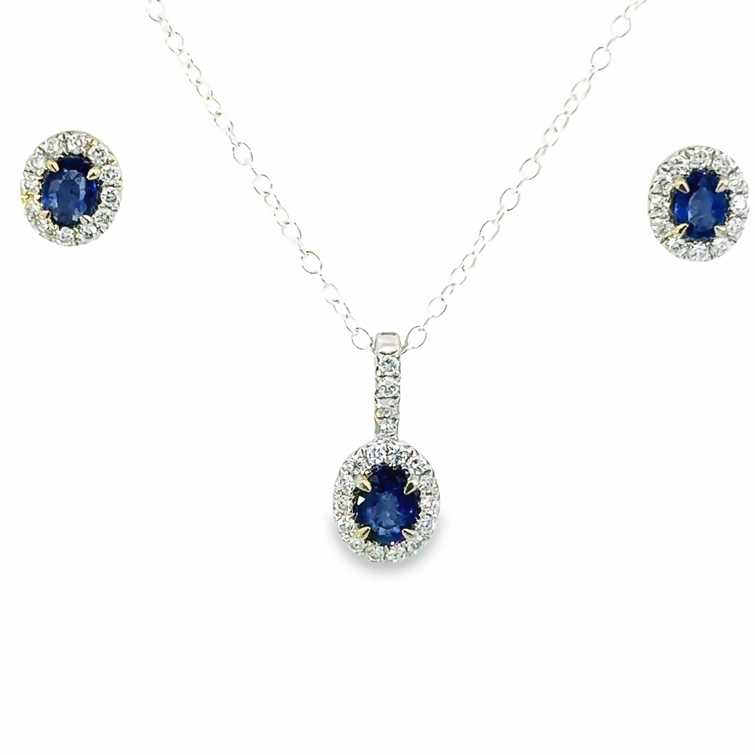 Elevate your elegance with this exquisite charm necklace. Crafted in lustrous white gold, it features a captivating oval cut sapphire of a deep blue hue. The brilliant cut enhances the sapphire’s natural brilliance, set within a halo of natural diamonds while the meticulously crafted setting showcases its clarity and pristine polish. A timeless piece for any discerning jewellery lover. Supplied without chain. Matching earrings and ring also available. See below.